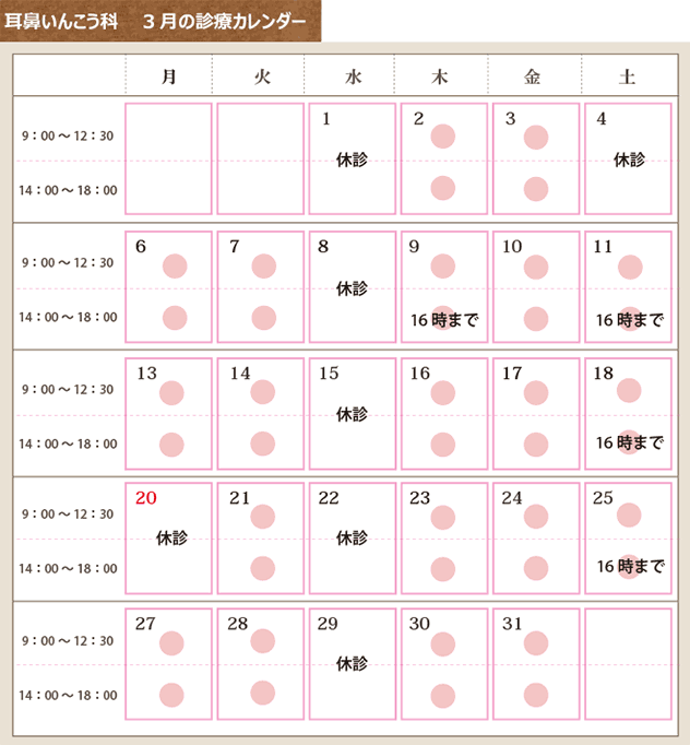 耳鼻いんこう科 4月の診療カレンダー
