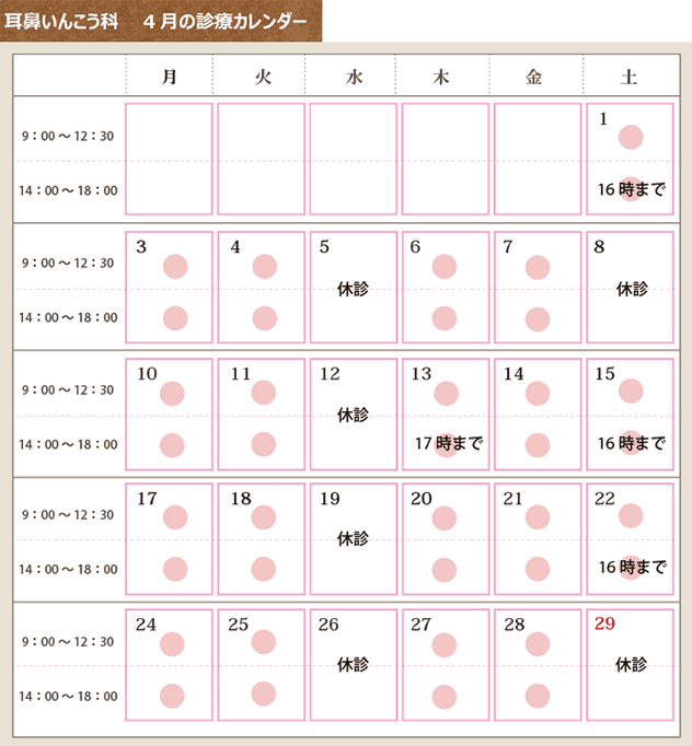 耳鼻いんこう科 4月の診療カレンダー