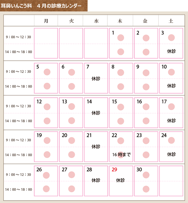 耳鼻いんこう科 4月の診療カレンダー