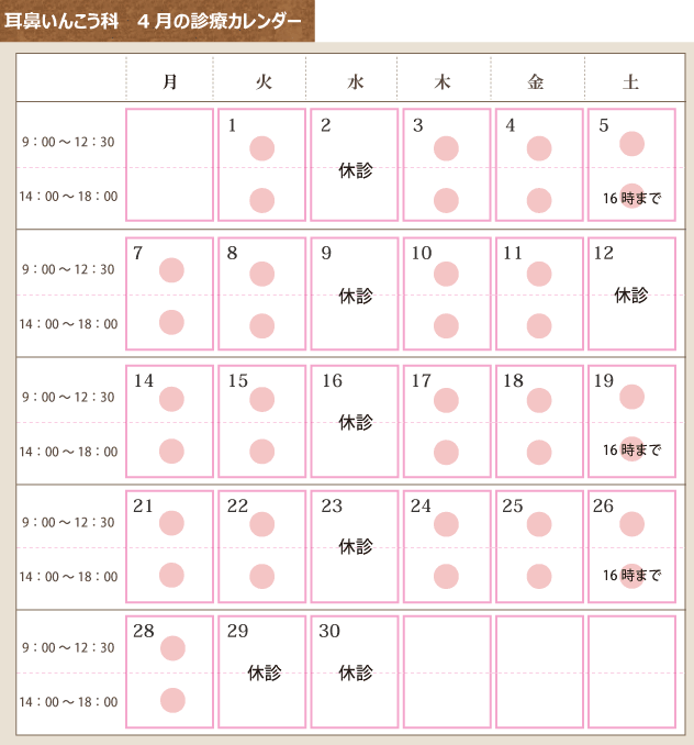 耳鼻いんこう科 4月の診療カレンダー