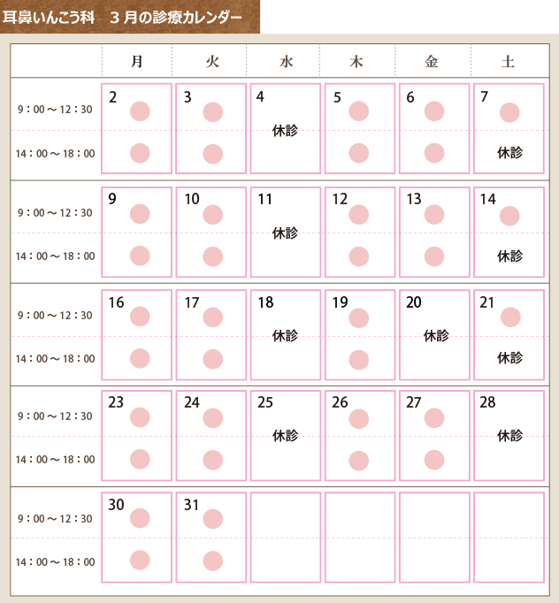 耳鼻いんこう科 3月の診療カレンダー